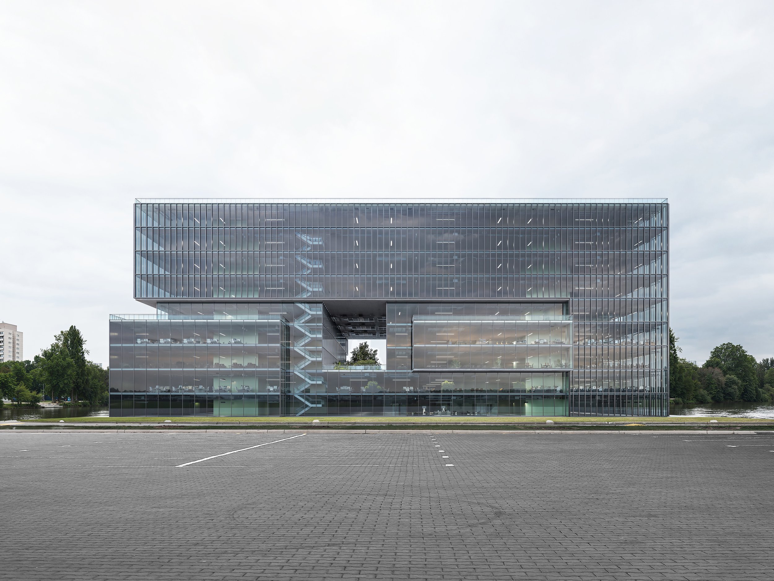 Designed for the HHN Group, this office building is defined by a precise structural rhythm and a strong sense of transparency. Conceived as a layered glass volume, the project balances lightness and scale through a clear horizontal organization, while a large central void cuts through the mass to introduce depth, openness, and a distinct architectural identity. The exposed circulation core becomes part of the composition, reinforcing the legibility of the building and bringing movement to the façade. Through the interplay of repetition, transparency, and subtraction, the project proposes a workplace architecture that feels efficient, luminous, and sharply contemporary.