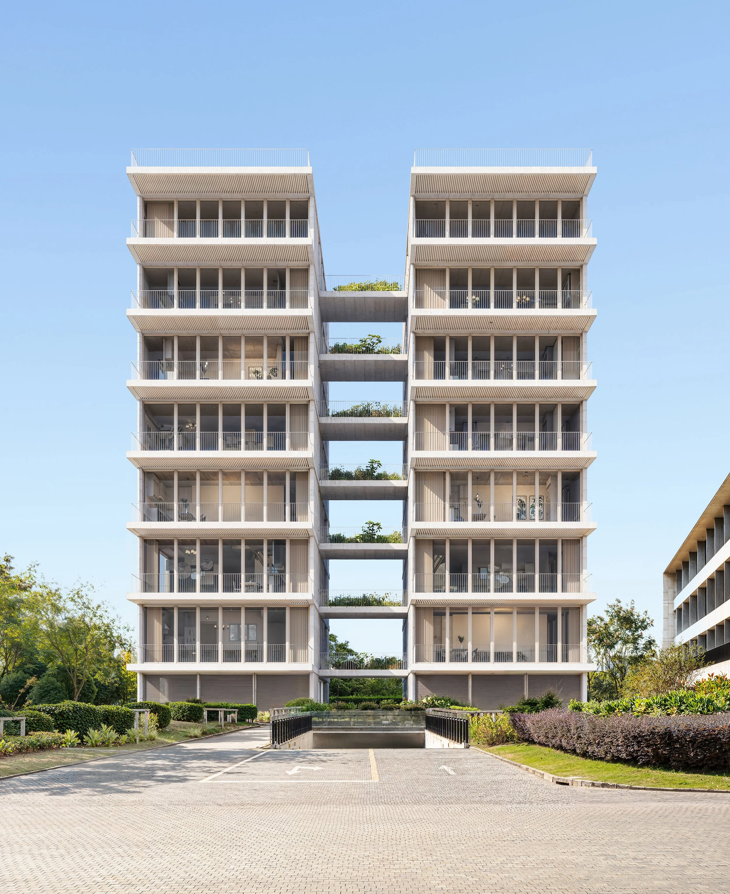 The project is structured by two mirrored volumes held apart by a central void that becomes the principal architectural figure. A sequence of open bridges and planted terraces occupies this gap, turning circulation and shared exterior space into a vertical landscape at the heart of the composition. The façades are defined by a rigorous grid of slabs, columns, and recessed glazing, giving the building a strong sense of rhythm and material restraint. Through the interplay of repetition, symmetry, and subtraction, the architecture develops a clear and elegant presence, where collective living is articulated through light, openness, and spatial continuity.