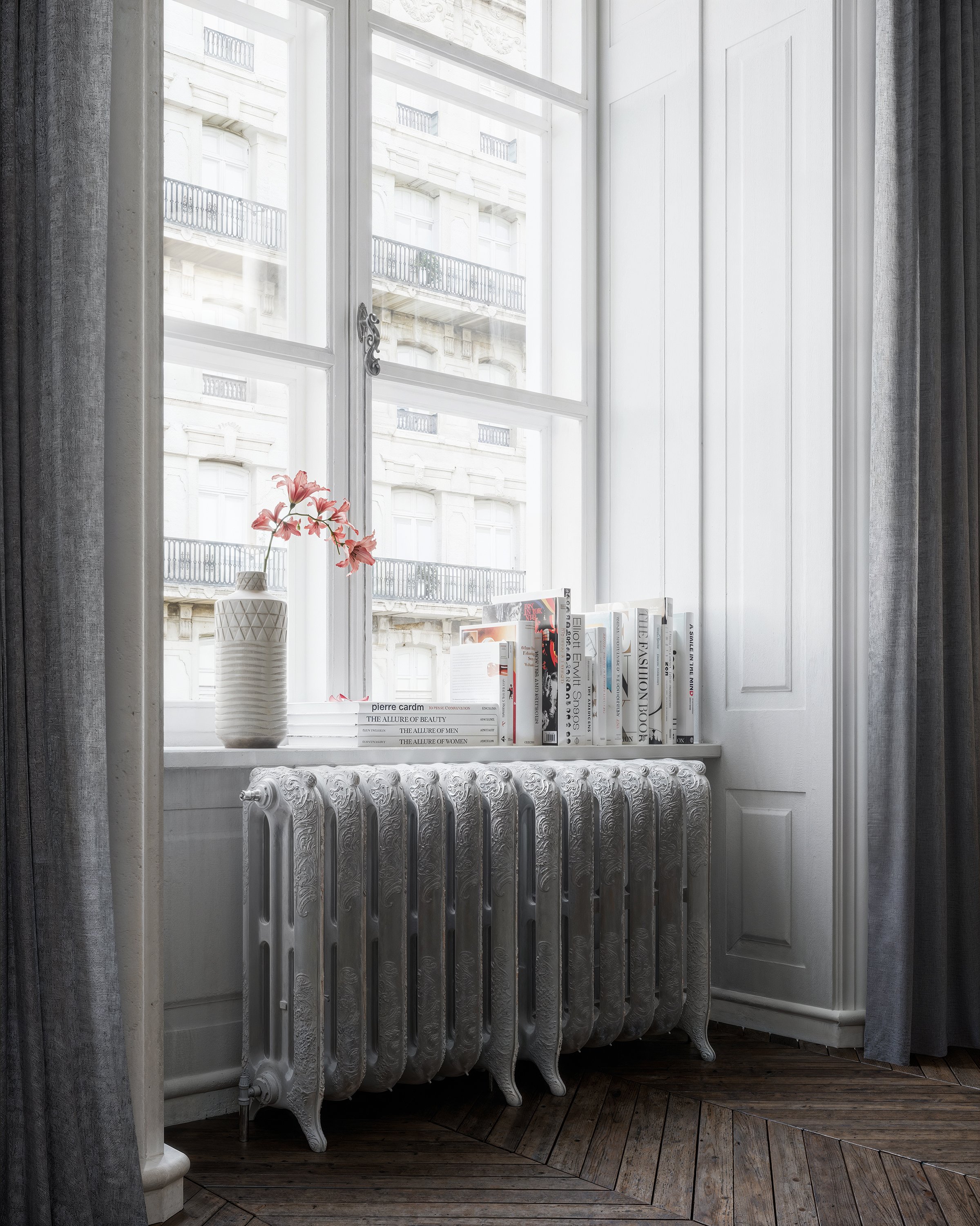 Designed for the Dupont Group, this Paris apartment renovation brings together the elegance of the historic interior with a calm contemporary sensibility. High ceilings, refined wall panelling, and a sculptural marble fireplace establish a strong classical framework, while a restrained palette of soft textiles and understated furnishings introduces warmth and comfort. Filtered daylight and carefully balanced tones give the space a luminous, tranquil atmosphere, creating an apartment that feels both timeless and quietly modern.